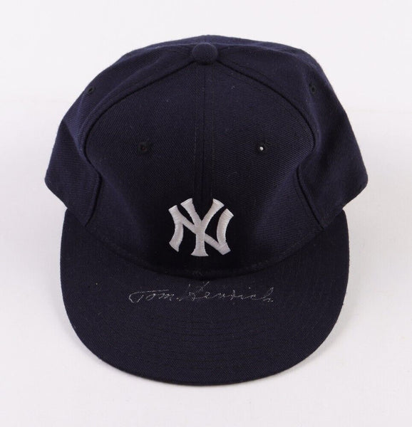 New Era New York Yankees fitted hat, size 6.75. Hand-signed on the brim by Tommy Henrich (New York Yankees 5xWorld Series Champion 1942, 1947-1950).Tommy played his entire MLB career as a right fielder and first baseman for the New York Yankees (1937-1942 and 1946-1950). Henrich led the American League in triples twice and in runs scored once, also hitting 20 or more home runs four times. He is best remembered for his numerous exploits in the World Series; he was involved in one of the most memorable plays in Series history in 1941, was the hitting star of the 1947 Series with a .323 batting average and hit the first Walk Off Home Run in Series history in the first game of the 1949 World Series. Tommy passed away in 2009 at the age of 96.The autograph includes an official Beckett Authentication Services serially-numbered hologram and matching COA for authenticity purposes.Authentication: Beckett COA
