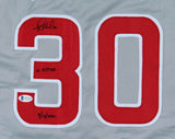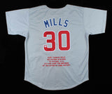 Custom on-field style jersey. Everything is sewn on, size XL. Hand-signed and inscribed by Alec Mills. Mills' career highlights have been custom stitched onto the back of the jersey below the reverse numbers.The lot / autograph(s) includes an official Beckett Authentication Services serially-numbered hologram and matching COA for authenticity purposes. The signing of this item was witnessed by Beckett.Authentication: Beckett COA