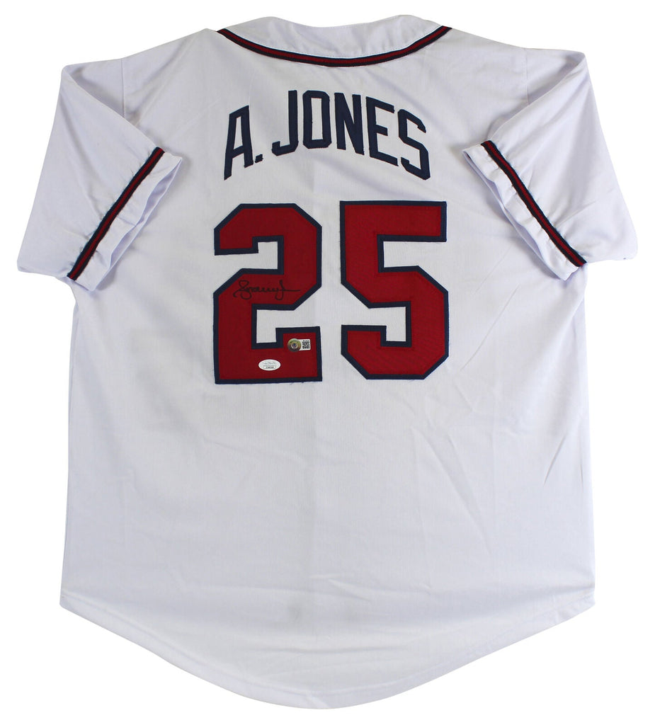 This Autographed White Pro Style Jersey has been Personally Signed by Andruw Jones of the Atlanta Braves. This item is 100% Authentic to include a Certificate of Authenticity (COA) / hologram by Beckett Authentication Services. We have multiples of this same item. While the photographs are representative of this item, the size, placement and strength of the signature may vary. Each item is hand signed, therefore, each autograph is unique. This is a X-Large sized, non-branded, custom-stitched Jersey.