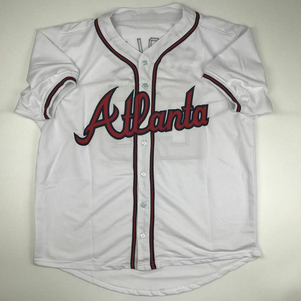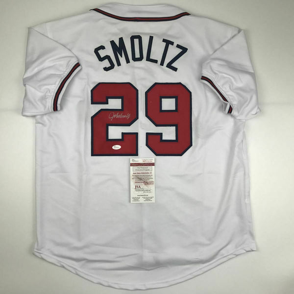 Autographed/Signed JOHN SMOLTZ Atlanta White Baseball Jersey JSA COA Auto This is a custom jersey and was not manufactured by or in any manner associated with any professional sports league or manufacturer. This custom jersey carries no professional sports league designation. The item is intended to be an autographed collectible. Reference of team in the title is to allow the purchaser a point of association. The custom jersey displays the name, number and authenticated signature of the player. This item in no way is affiliated with or connected to any professional sports organization. The autograph, as always is guaranteed to be authentic and has been certified as authentic by a third-party, trusted authenticator. Size is XL unless otherwise noted.