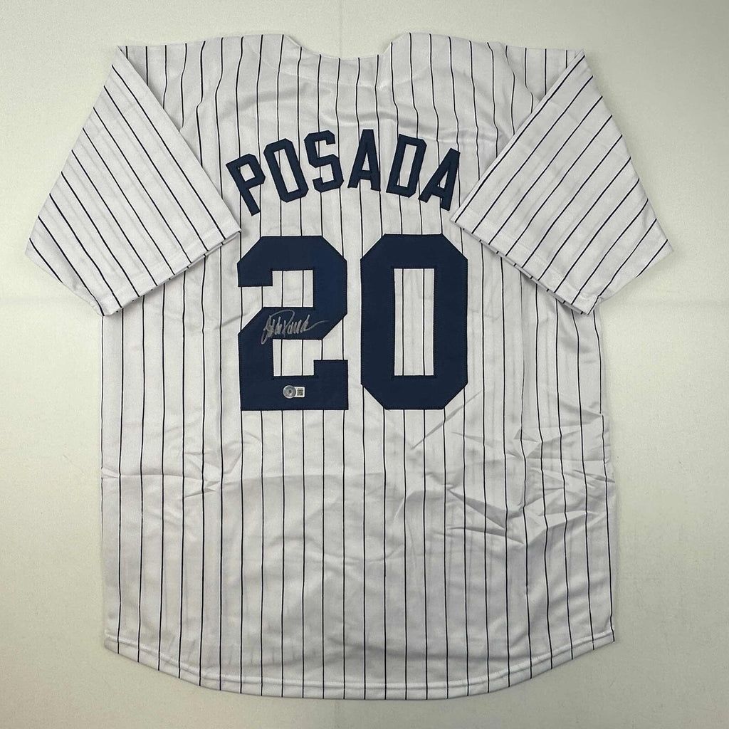 Autographed/Signed Jorge Posada New York Pinstripe Jersey Beckett BAS COA Jersey has no brand names or logos. This is a custom jersey and was not manufactured by or in any manner associated with any professional sports league or manufacturer. This custom jersey carries no professional sports league designation. The item is intended to be an autographed collectible. The custom jersey displays the name and number of the player. This item in no way is affiliated with or connected to any professional sports organization. Size is XL.
