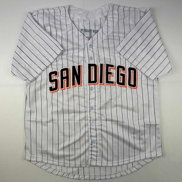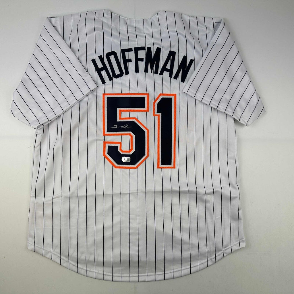 Autographed/Signed Trevor Hoffman San Diego Pinstripe Jersey Beckett BAS COA Jersey has no brand names or logos. This is a custom jersey and was not manufactured by or in any manner associated with any professional sports league or manufacturer. This custom jersey carries no professional sports league designation. The item is intended to be an autographed collectible. The custom jersey displays the name and number of the player. This item in no way is affiliated with or connected to any professional sports organization. Size is XL.