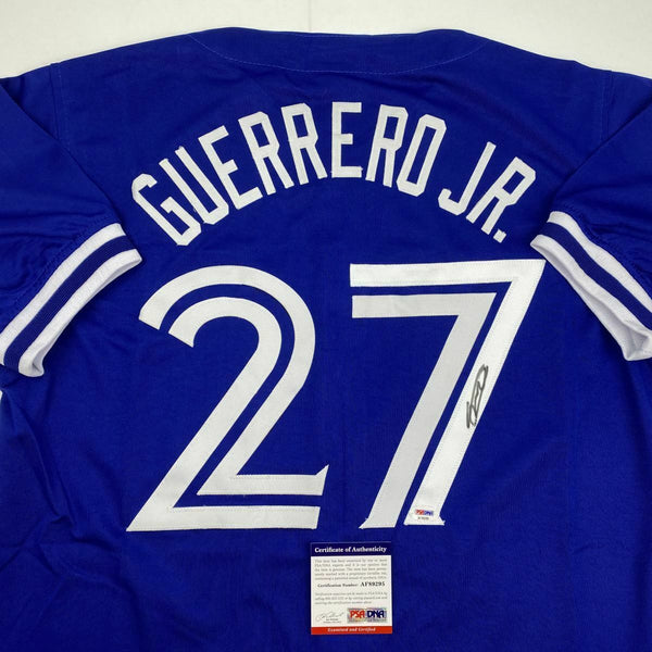 Autographed/Signed VLADIMIR VLAD GUERRERO JR Toronto Blue Jersey PSA/DNA COA This is a custom jersey and was not manufactured by or in any manner associated with any professional sports league or manufacturer. This custom jersey carries no professional sports league designation. The item is intended to be an autographed collectible. Reference of team in the title is to allow the purchaser a point of association. The custom jersey displays the name, number and authenticated signature of the player. This item in no way is affiliated with or connected to any professional sports organization. The autograph, as always is guaranteed to be authentic and has been certified as authentic by a third-party, trusted authenticator. Size is XL unless otherwise noted.