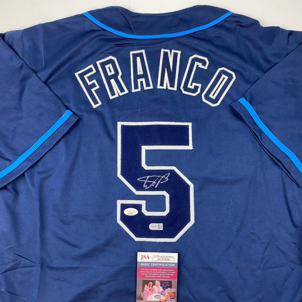 Autographed/Signed Wander Franco Tampa Bay Dark Blue Baseball Jersey JSA COA Jersey has no brand names or logos. This is a custom jersey and was not manufactured by or in any manner associated with any professional sports league or manufacturer. This custom jersey carries no professional sports league designation. The item is intended to be an autographed collectible. The custom jersey displays the name and number of the player. This item in no way is affiliated with or connected to any professional sports organization. Size is XL.