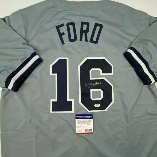 Autographed/Signed WHITEY FORD New York Grey Baseball Jersey PSA/DNA COA Auto This is a custom jersey and was not manufactured by or in any manner associated with any professional sports league or manufacturer. This custom jersey carries no professional sports league designation. The item is intended to be an autographed collectible. Reference of team in the title is to allow the purchaser a point of association. The custom jersey displays the name, number and authenticated signature of the player. This item in no way is affiliated with or connected to any professional sports organization. The autograph, as always is guaranteed to be authentic and has been certified as authentic by a third-party, trusted authenticator. Size is XL unless otherwise noted.