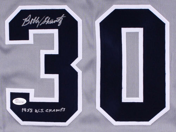 Custom on-field style jersey. Everything is sewn on. Hand-signed and inscribed in silver paint pen by Bobby Shantz (Philadelphia & Kansas City Athletics, New York Yankees, Pittsburgh Pirates, Houston Colt 45's, St. Louis Cardinals, Chicago Cubs, Philadelphia Phillies). The lot / autograph(s) includes an official James Spence Authentication (JSA) hologram and matching COA for authenticity purposes. The signing of this item was witnessed by JSA.Authentication: JSA COA