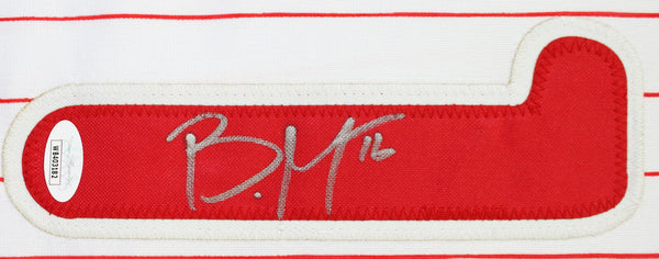 This Autographed White Pinstripe Pro Style Jersey has been Personally Signed by Brandon Marsh of the Philladelphia Phillies. This item is 100% Authentic to include a Certificate of Authenticity (COA) / hologram by JSA Witness. This is a JSA Witnessed Protection Program item which means a JSA representative was present when this item was being signed. We conducted an autograph signing with Brandon Marsh where multiples of the same item were signed. While the photographs are representative of this item, the size, placement and strength of the signature may vary. Each item is hand signed, therefore, each autograph is unique. This item can be verified through JSA Witness. This is a X-Large sized, non-branded, custom-stitched Jersey.