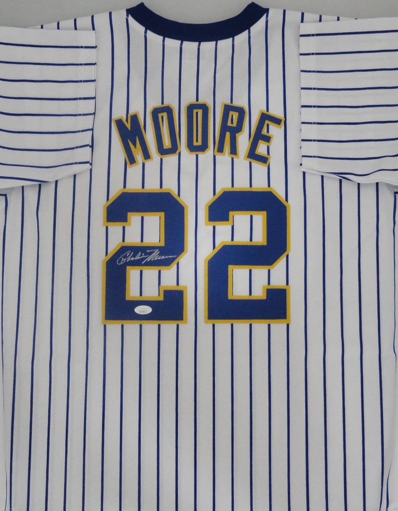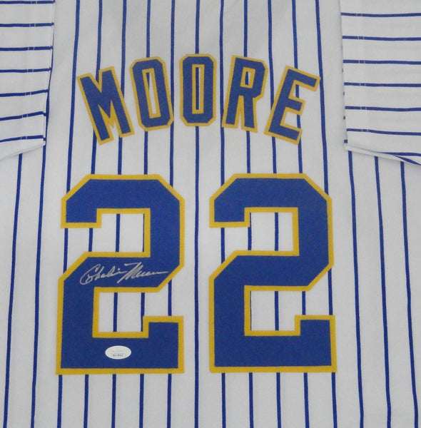 Custom Replica Jersey of former Milwaukee Brewers 1982 AL Champ CHARLIE MOORE. This jersey is signed with Silver Paint Pen. This jersey is size XL with all letters and numbers sewn in. This item was signed at a signing in our store and would make a great addition to any Brewers collection. This autograph is guaranteed to be 100% authentic and will include a COA from JSA (James Spence Authentication).