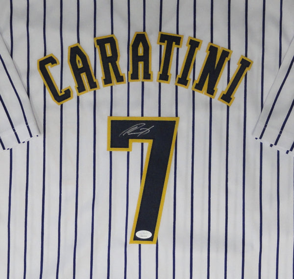 Custom replica jersey of Milwaukee Brewers Catcher VICTOR CARATINI. This jersey is signed with Silver Paint Pen and is size XL with all letters and numbers sewn in. This item was signed at a private signing in our store and would make a great addition to any Brewers collection. This autograph is guaranteed to be 100% authentic and will include a COA from JSA (James Spence Authentication).