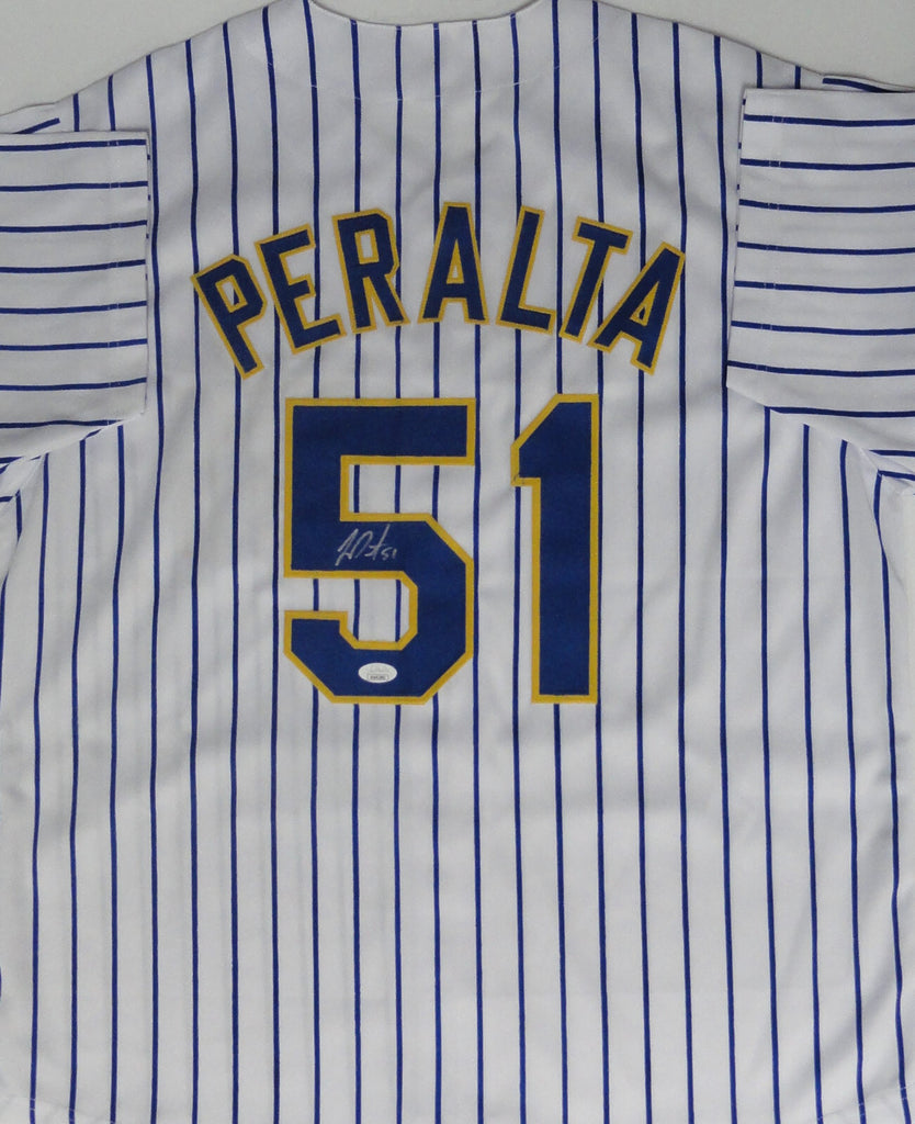 Custom replica jersey of Milwaukee Brewers All Star Pitcher FREDDY PERALTA. This jersey is signed with Silver Paint Pen and is size XL with all letters and numbers sewn in. This item was signed at a private signing in our store and would make a great addition to any Brewers collection. This autograph is guaranteed to be 100% authentic and will include a COA from JSA (James Spence Authentication).
