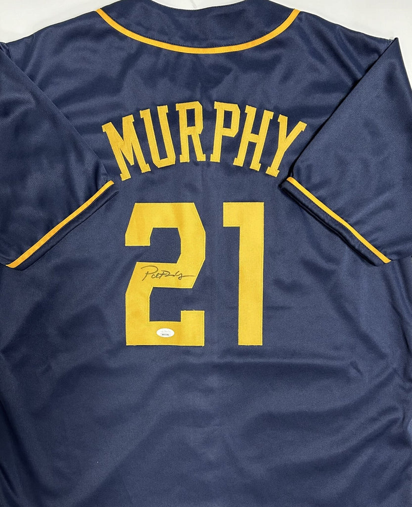 Custom Replica Jersey by Milwaukee Brewers Manager PAT MURPHY. This jersey is signed with Blue paint pen. This jersey is size XL with all letters and numbers sewn in. This item was signed at a private signing and would make a great addition to any BREWERS collection. This autograph is guaranteed to be 100% authentic and will include a COA from JSA authentication.
