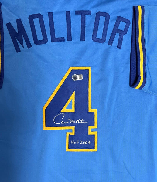 autographed custom replica jersey of Milwaukee Brewers Hall of Famer PAUL MOLITOR. This jersey is signed with Silver Paint Pen with the inscription "HOF 2004". This jersey is size XL with all letters and numbers sewn in. This item was signed at a private signing with us and would make a great addition to any Brewers collection. This autograph is guaranteed to be 100% authentic and will include a COA hologram from Beckett authentication.