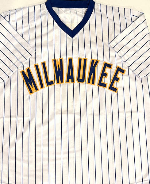 autographed custom replica jersey of Milwaukee Brewers Hall of Famer PAUL MOLITOR. This jersey is signed with Silver Paint Pen with the inscription "HOF 2004". This jersey is size XL with all letters and numbers sewn in. This item was signed at a private signing with us and would make a great addition to any Brewers collection. This autograph is guaranteed to be 100% authentic and will include a COA hologram from Beckett authentication.