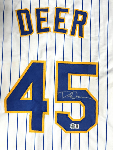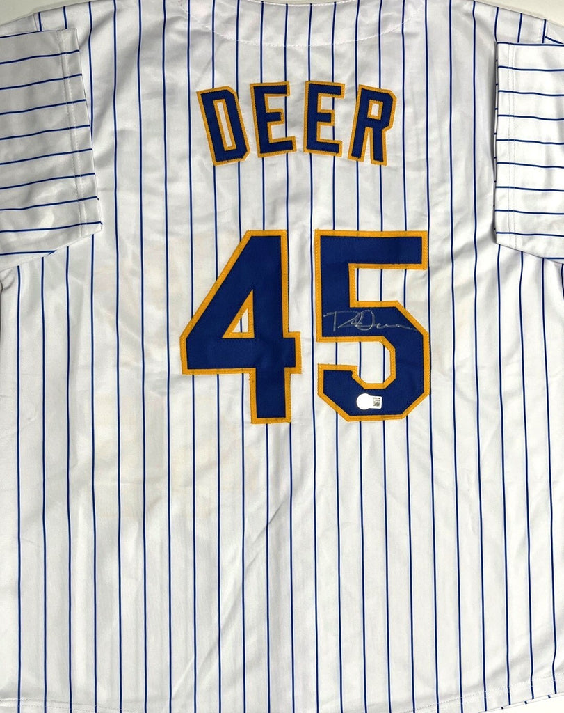 Custom Replica Jersey of former Milwaukee Brewers legend ROB DEER. This jersey is signed with Silver Paint Pen. This jersey is size XL with all letters and numbers sewn in. This item was signed at a signing in our store and would make a great addition to any Brewers collection. This autograph is guaranteed to be 100% authentic and will include a COA hologram from Beckett Authentication.
