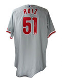 Majestic on-field style jersey. Everything is sewn on, size XL. Hand-signed by Carlos Ruiz (Philadelphia Phillies).The lot / autograph(s) includes an official James Spence Authentication (JSA) hologram and matching COA for authenticity purposes. The signing of this item was witnessed by JSA.Authentication: JSA COA