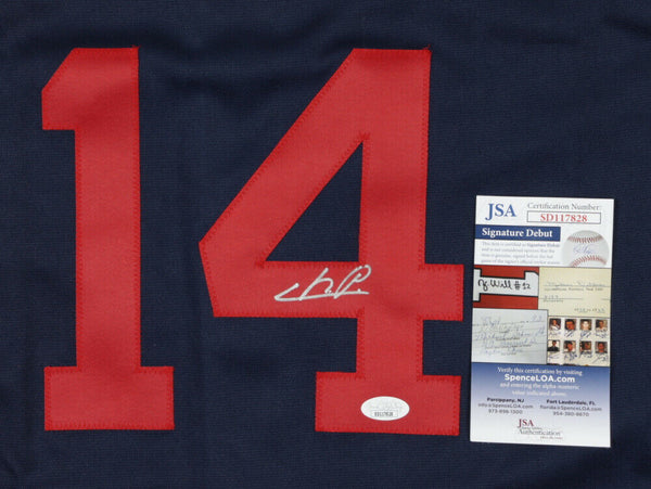 Custom on-field style jersey. Everything sewn on, size XL. Hand-signed by Cristian Pache.The autograph(s) includes an official James Spence Authentication (JSA) "Signature Debut" hologram and COA. "Signature Debut" is the autographed memorabilia equivalent to a rookie card. The JSA definition of a "Signature Debut" is as follows: "Any item that is autographed and received by JSA prior to the last game of the signer's official rookie season. Authentication: JSA COA