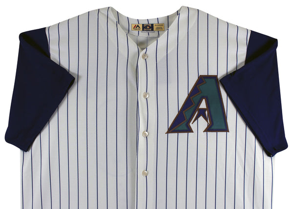 This Autographed Pinstripe Majestic Coolbase jersey with the inscription of ".283 BA, 354 HRs, 2,591 Hits, 1,439 RBI, 596 2B, 5X All Star, 2001 Silver Slugger, 2001 World Series Game 7 Game Winning Hit" has been Personally Signed by Luis Gonzalez of the Arizona Diamondbacks. This is a BAS Witnessed Protection Program item which means a Beckett Authentication Service representative was present when this item was being signed. We conducted an autograph signing with Luis Gonzalez where multiples of the same item were signed. While the photographs are representative of this item, the size, placement and strength of the signature may vary. Each item is hand signed, therefore, each autograph is unique. This item can be verified through BAS Witnessed.