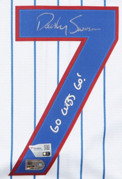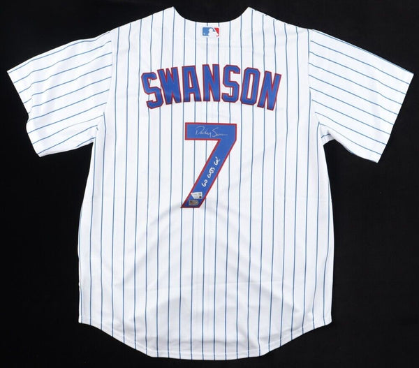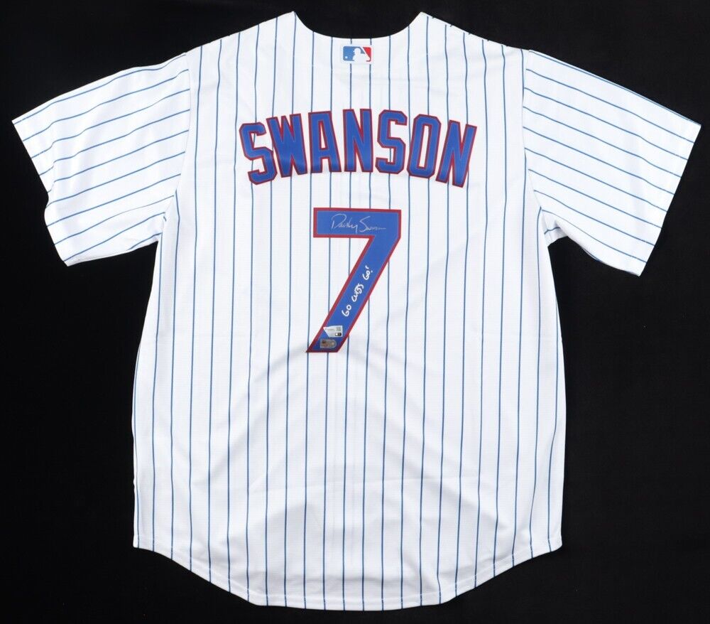 Nike jersey with everything pressed on, size Adult Large. Hand-signed and inscribed by Dansby Swanson (Chicago Cubs).The autograph includes an official MLB Authentication hologram as well as a Fanatics hologram for authenticity purposes.Authentication: MLB Hologram & Fanatics Hologram