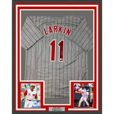 Framed Autographed/Signed Barry Larkin 33x42 Cincinnati Grey Jersey BAS COA The item is professionally framed and matted with two 5x7 photos, measures 35 inches by 39 inches and is ready to be hung in your man cave! Photo and matting requests can be made.