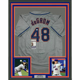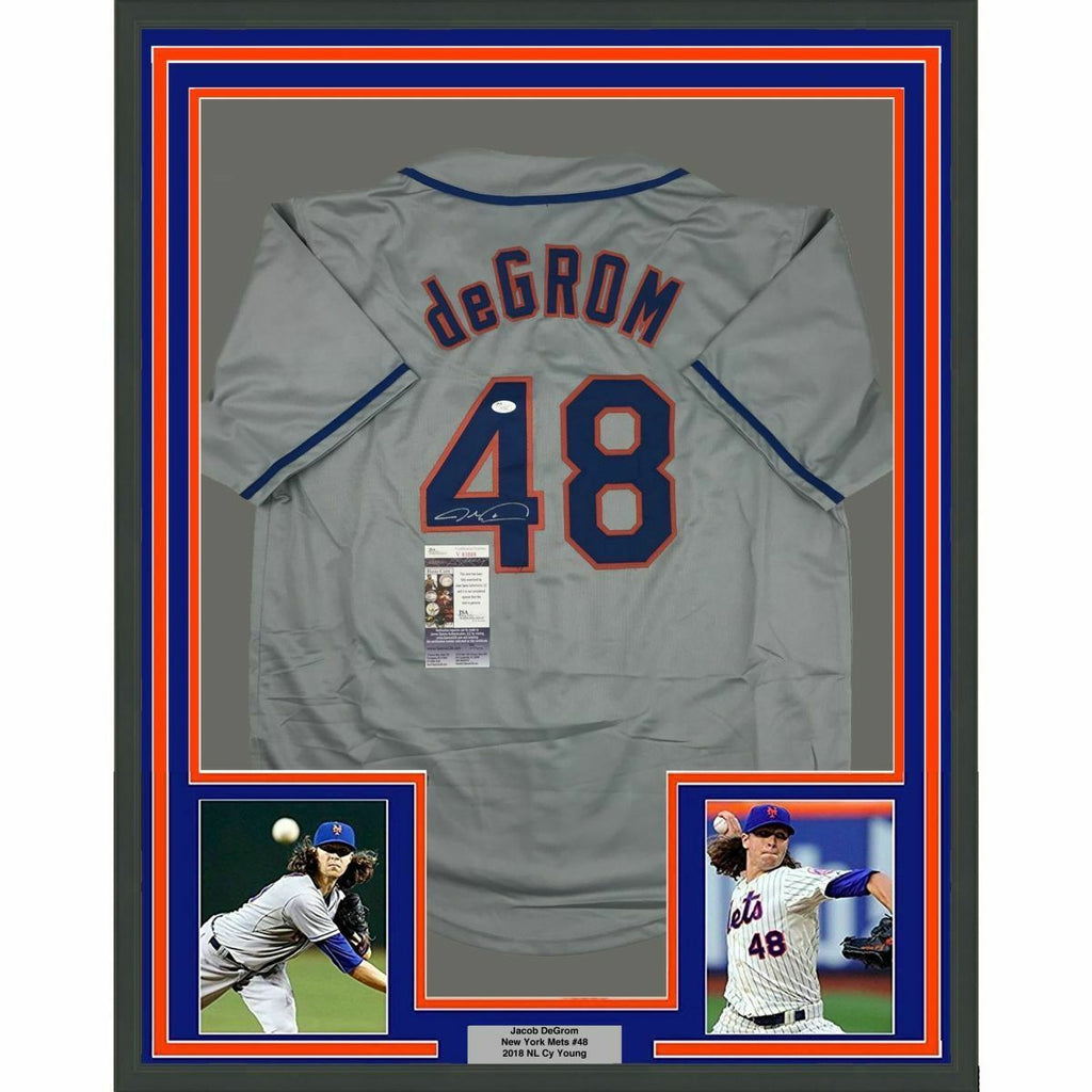 FRAMED Autographed/Signed JACOB DEGROM 33x42 New York Grey Jersey JSA COA Auto The item is professionally framed & matted with two 8x10 photos, measures 33"x42" and is ready to be hung in your man cave! NOTE: COA card will be mounted on the back of the frame, not inside it on top of the jersey as seen in the picture. Please allow up to 5 business days for the item to be framed, packaged safely, and picked up by UPS. Photo and matting requests can be made.