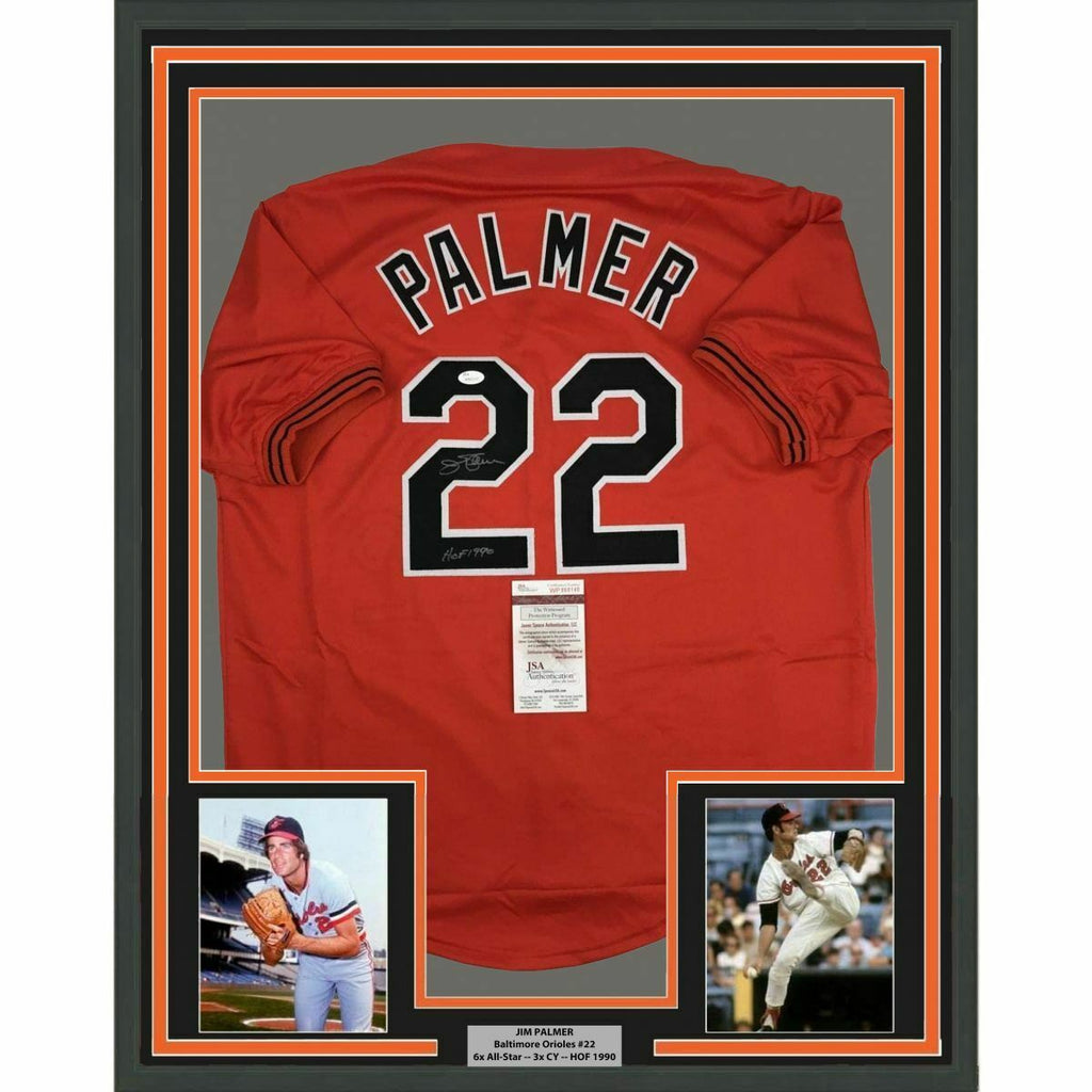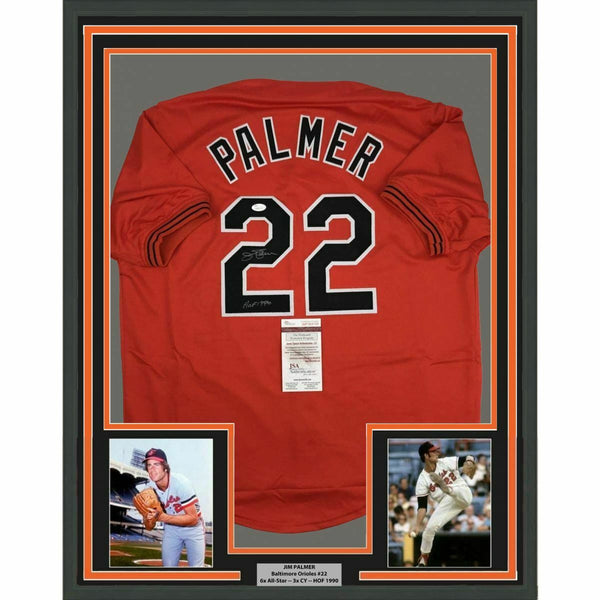 FRAMED Autographed/Signed JIM PALMER 33x42 Baltimore Orange Jersey JSA COA Auto The item is professionally framed and matted with two 8x10 photos, measures 33x42 inches and is ready to be hung in your man cave! NOTE: COA card will be mounted on the back of the frame, not inside it on top of the jersey as seen in the picture.