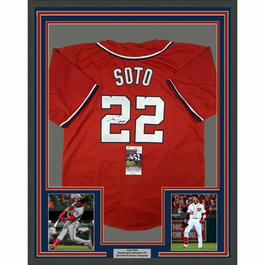 FRAMED Autographed/Signed JUAN SOTO 33x42 Washington Red Baseball Jersey JSA COA The item is professionally framed & matted with two 8x10 photos, measures 33"x42" and is ready to be hung in your man cave! NOTE: COA card will be mounted on the back of the frame, not inside it on top of the jersey as seen in the picture. Please allow up to 5 business days for the item to be framed, packaged safely, and picked up by UPS. Photo and matting requests can be made.