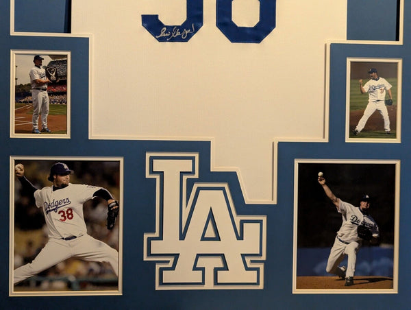 Custom Framed Eric Gagne hand signed Los Angeles Dodgers Jersey.JSA COAThe authentication is from JSA. This signature is WITNESSED by a representative of Beckett! 100% AUTHENTIC! The jersey has fully stitched numbers on the front and back. It is a great item and a must for all great sports fans!This item is professionally framed, it measures 32"x40" inside , 42"x34" outside , using UV protective Acrylic glass for safe keeping and safe transport, team color matting, black moulding and hanging hooks on the back. All additional items in frame seen in pictures included. 100% ready to hang in your fan cave.