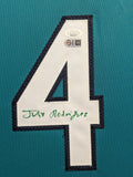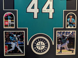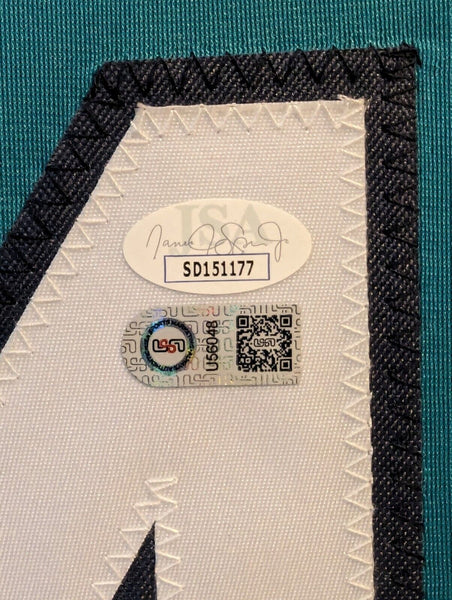 Custom Framed Julio Rodriguez hand signed Seattle Mariners style custom jersey.2022 ROY JerseyJSA Sticker only, no cert card includedThe authentication is from JSA. This signature is WITNESSED by a representative of JSA! 100% AUTHENTIC!!! The jersey has fully stitched numbers on the front and back. It is a great item and a must for all great sports fans!This item is professionally framed, it measures 32"x40" inside , 42"x34" outside , using UV protective Acrylic glass for safe keeping and safe transport, team color matting, black moulding and hanging hooks on the back. All additional items in frame seen in pictures included. 100% ready to hang in your fan cave.
