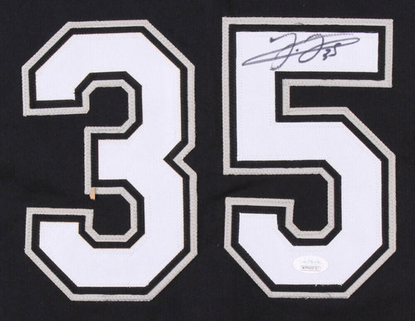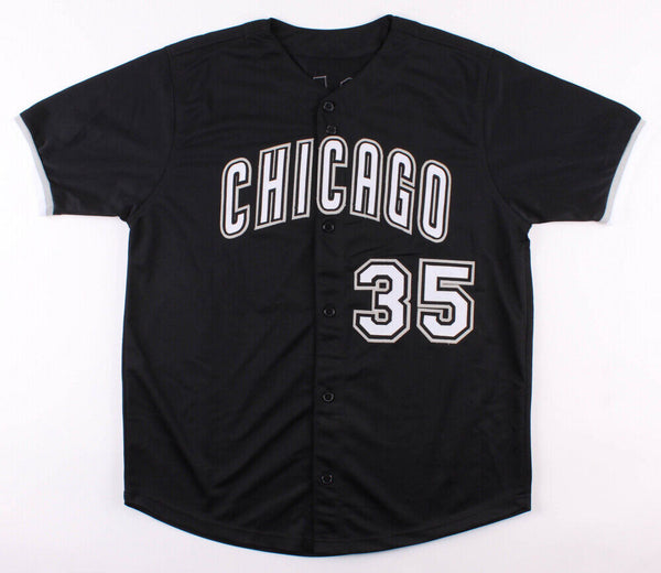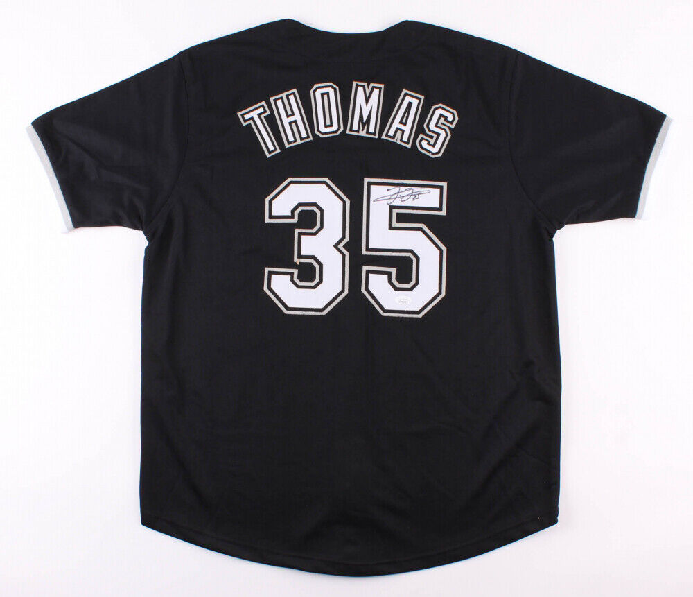 Custom on-field style jersey. Everything is sewn on, size XL. Hand-signed in black felt-tip pen by Frank Thomas (HOF). The lot / autograph(s) includes an official James Spence Authentication (JSA) hologram and matching COA for authenticity purposes. The signing of this item was witnessed by JSA.Authentication: JSA COA