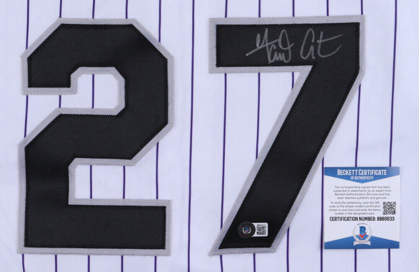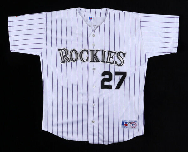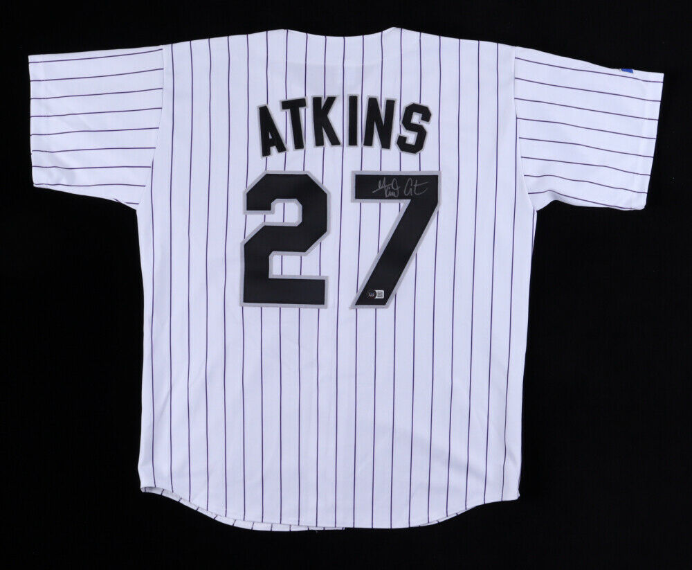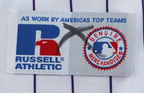 Russell Athletic on-field style jersey. Everything sewn on, size XL. Hand-signed by Garrett Atkins. Please note, there is a marker stain on the tag.The lot / autograph(s) includes an official Beckett Authentication Services serially numbered hologram and matching COA for authenticity purposes. Authentication: Beckett COA