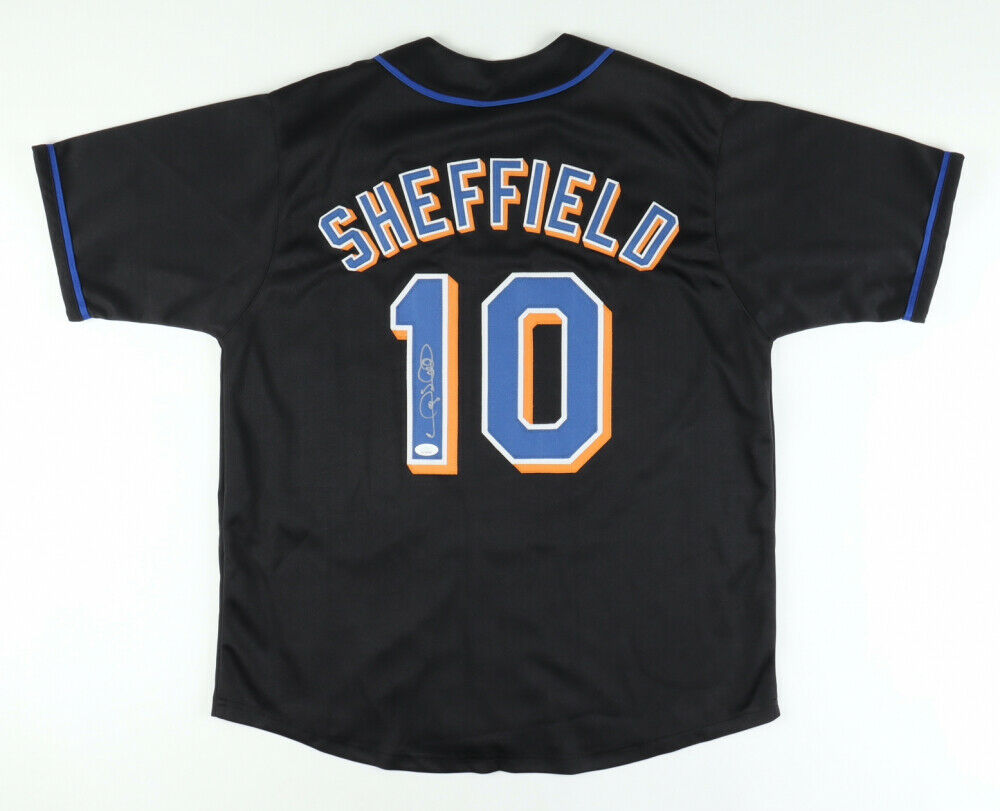 Custom on-field style jersey. Everything is sewn on, size XL. Hand-signed in silver paint pen by Gary Sheffield. Gary Sheffield played with 8 teams from 1988 to 2009 including the Milwaukee Brewers, San Diego Padres, Florida Marlins, Los Angeles Dodgers, Atlanta Braves, New York Yankees, Detroit Tigers, and the New York Mets. At the start of the 2010 season, Sheffield ranked second among all active players in walks (1,475), third in runs (1,636), fourth in RBIs (1,676), fifth in hits (2,689) and home runs (509). Sheffield hit his 500th home run on April 17, 2009. The autograph includes an official James Spence Hologram and matching COA for authenticity purposes.Authentication: JSA COA