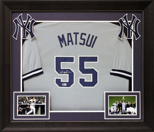 This Autographed Grey Pro Style Framed Jersey has been Personally Signed by Hideki Matsui of the New York Yankees. This item is 100% Authentic to include a hologram by Beckett Authentication Services. This item will come with an affixed Beckett Authentication Services (BAS) authentication sticker, which includes a scannable QR code to verify authenticity. Please note that Beckett no longer provides serial-numbered COA cards, and the attached BAS sticker will serve as the complete authentication for this item. This is a BAS Witnessed Protection Program item which means a Beckett Authentication Service representative was present when this item was being signed. We conducted an autograph signing with Hideki Matsui where multiples of the same item were signed. While the photographs are representative of this item, the size, placement and strength of the signature may vary. Each item is hand signed, therefore, each autograph is unique. This item can be verified through BAS Witnessed. This item has been professionally framed to overall dimensions of approximately 32 x 37 inches. This is a X-Large sized, non-branded, custom-stitched Framed Jersey. This jersey will be framed to order, it will take 3-4 days from purchase date for it to ship.