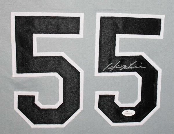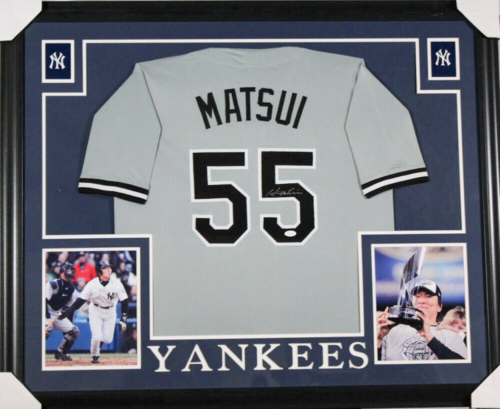 Custom frame measures approximately 35" x 43" in size and features a jersey which has been hand-signed in silver paint pen by Hideki Matsui. The lot / autograph(s) includes an official James Spence Authentication (JSA) hologram and matching COA for authenticity purposes. The signing of this item was witnessed by JSA.Authentication: JSA COA