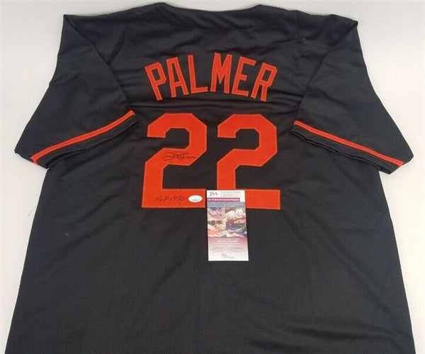 Custom on-field style jersey. Everything sewn on, size XL. Hand-signed in black felt-tip pen by Jim Palmer (HOF). The lot / autograph(s) includes an official JSA Witnessed hologram and matching COA for authenticity purposes.Authentication: JSA COA