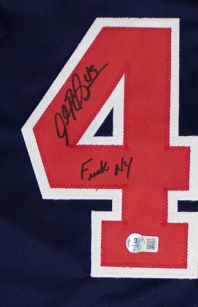 Custom on field style jersey. Everything is sewn on, size XL. Hand-signed in black Sharpie pen by John Rocker. When signing, Rocker inscribed "F*ck NY" along with his signature. During an interview, he spoke of his opinion of the Mets and their fans: Nowhere else in the country do people spit at you, throw bottles at you, throw quarters at you, throw batteries at you and say, "Hey, I did your mother last night--she's a whore." I talked about what degenerates they were and they proved me right.This autograph is certified by Beckett Authentication Services (BAS) Witness Certification. That means that a Beckett representative was present when this item was signed. It comes with the numbered authentication hologram with a QR code card that verifies the authentication on the Beckett website.Custom on-field style jerseys are a more affordable option for autograph seekers. These jerseys do not have any brand name or tags and are made in the Philippines. They feature stitched on names and numbers and are made to look very similar to the on-field jerseys that the players wear. These custom jerseys are very commonly used in the memorabilia industry.