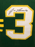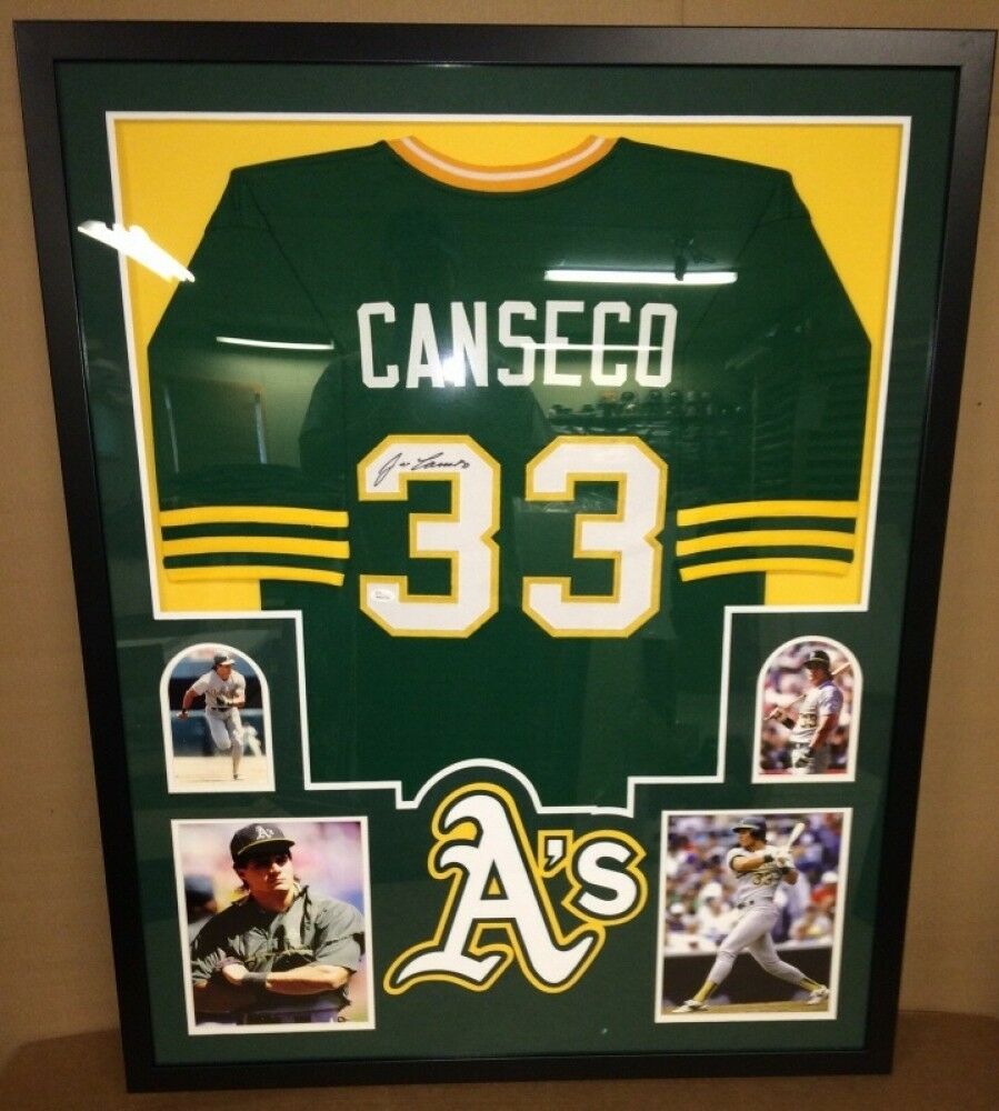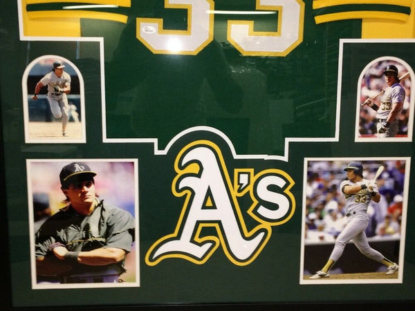 Custom frame measures approximately 35" x 42" in size and features a jersey hand-signed in black felt tip pen by Jose Canseso. The autograph includes an official James Spence Authentication (JSA) hologram and matching COA for authenticity purposes. The signing of this item was witnessed by JSA. Authentication: JSA COA