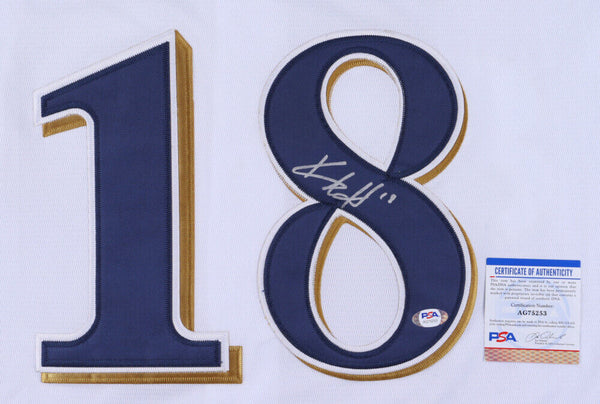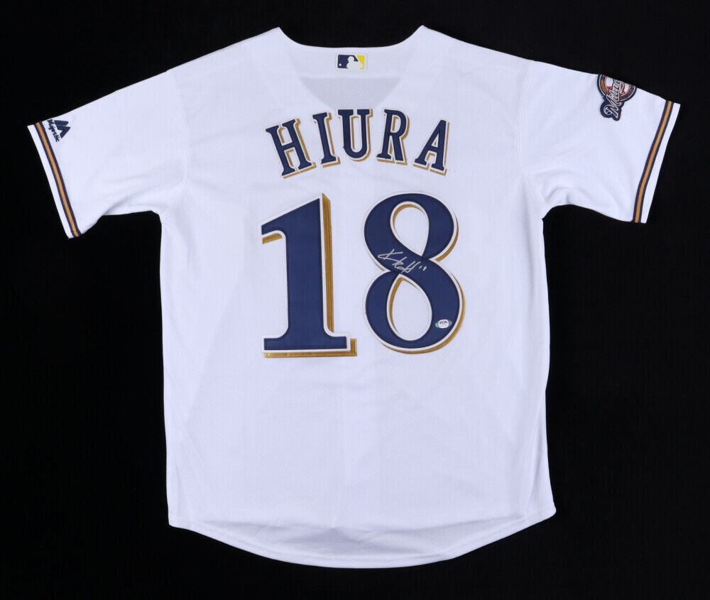 Custom on-field Majestic style jersey. Everything sewn on, size adult Large. Hand-signed by Keston Hiura (Milwaukee Brewers). Please note, staining on the reverse side of the jersey.The lot / autograph(s) includes an official PSA/DNA hologram and matching COA for authenticity purposes.Authentication: PSA COA