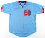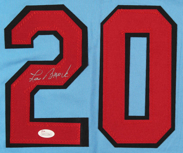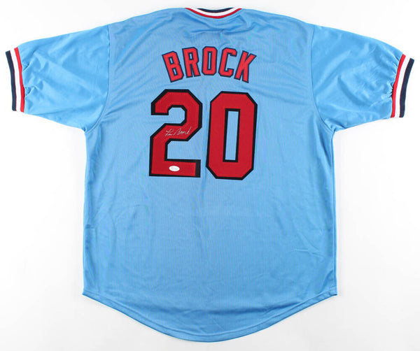 Custom on-field style jersey. Everything is sewn on, size XL. Hand-signed in silver felt-tip pen by Lou Brock (HOF). The lot / autograph(s) includes an official James Spence Authentication (JSA) hologram and matching COA for authenticity purposes. The signing of this item was witnessed by JSA.Authentication: JSA COA