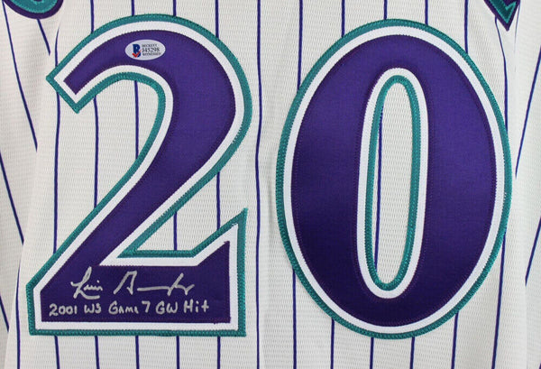 Majestic Cooperstown Collection on-field style jersey. Everything is sewn on, size XL. Hand-signed and inscribed in silver paint pen by Luis Gonzalez. The lot / autograph(s) includes an official Beckett Authentication Services serially numbered hologram and matching COA for authenticity purposes. The signing of this item was witnessed by Beckett.Authentication: Beckett COA