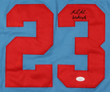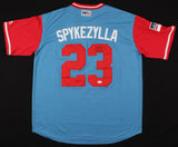Majestic on-field style jersey. Everything sewn on, size XL. Jersey has been hand-signed and inscribed in black felt-tip pen by Mike Minor. Please see photos for more details on the condition of the jersey. The lot / autograph(s) includes an official James Spence Authentication (JSA) hologram and matching COA for authenticity purposes.Authentication: JSA COA