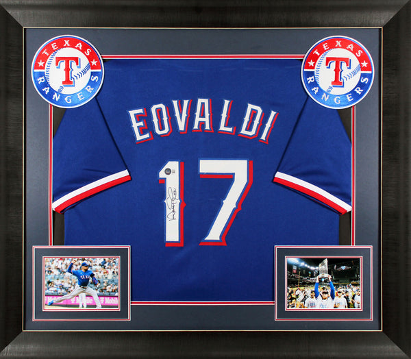 This Autographed Blue Pro Style Framed Jersey has been Personally Signed by Nathan Eovaldi of the Texas Rangers. This item is 100% Authentic to include a hologram by Beckett Authentication Services. This item will come with an affixed Beckett Authentication Services (BAS) authentication sticker, which includes a scannable QR code to verify authenticity. Please note that Beckett no longer provides serial-numbered COA cards, and the attached BAS sticker will serve as the complete authentication for this item. This is a BAS Witnessed Protection Program item which means a Beckett Authentication Service representative was present when this item was being signed. We conducted an autograph signing with Nathan Eovaldi where multiples of the same item were signed. While the photographs are representative of this item, the size, placement and strength of the signature may vary. Each item is hand signed, therefore, each autograph is unique. This item can be verified through BAS Witnessed. This item has been professionally framed to overall dimensions of approximately 32 x 37 inches. This is a X-Large sized, non-branded, custom-stitched Framed Jersey. This jersey will be framed to order, it will take 3-4 days from purchase date for it to ship.