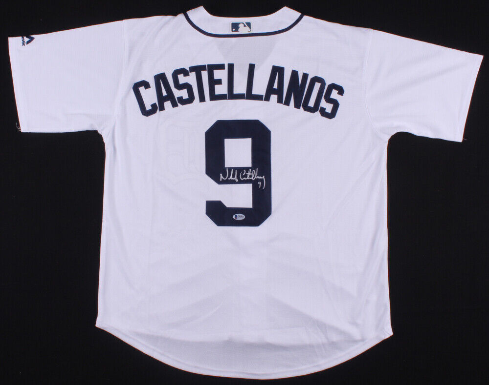 Custom on-field style jersey. Everything sewn on, size L. Hand-signed in silver paint pen by Nicholas Castellanos. The lot / autograph(s) includes an official James Spence Authentication (JSA) hologram and matching COA for authenticity purposes.Authentication: JSA COA