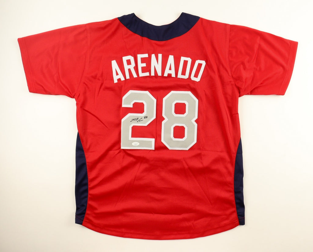 This autographed jersey has been personally hand-signed by Nolan Arenado of the Colorado Rockies & St. Louis Cardinals. 2018 was his 4th of 8 All Star Game appearances at 3rd Base.This autograph is certified by James Spence Authentication (JSA). It comes with the numbered hologram and matching Certificate of Authenticity.Custom on-field style jerseys are a more affordable option for autograph seekers. These jerseys do not have any brand name or tags and are made in the Philippines. They feature stitched on names and numbers and are made to look very similar to the on-field jerseys that the players wear. These custom jerseys are very commonly used in the memorabilia industry.