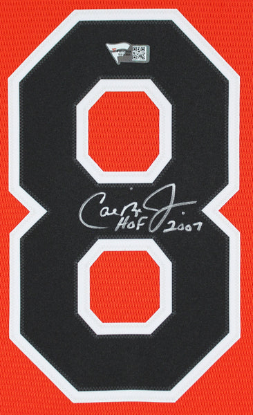 This Autographed Orange Nike Jersey with the inscription of "HOF 2007" has been Personally Signed by Cal Ripken Jr. of the Baltimore Orioles. This item is 100% Authentic to includes a numbered hologram by Fanatics. The authenticity can be verified on Fanatics website. This is a X-Large sized, non-branded, custom-stitched Jersey.