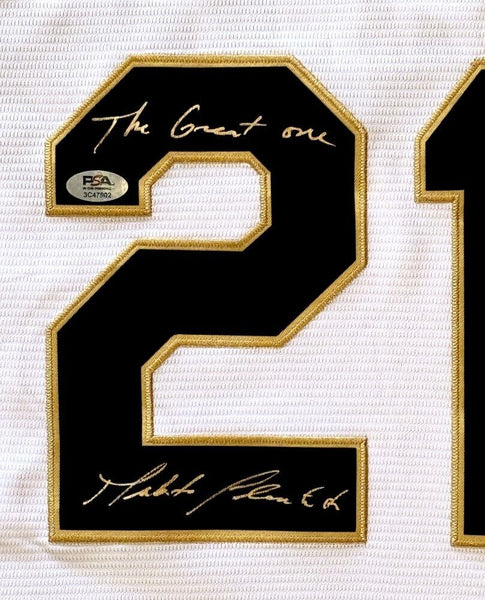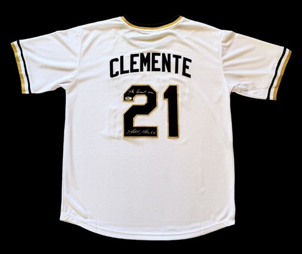 Custom on-field style style jersey with everything sewn on, size adult XL. Hand-signed and inscribed by Roberto Clemente Jr (The son of Pirates Superstar Roberto Clemente Sr.).The inscription that was made by Clemente Jr. marked the date that Clemente had his 3000th hit on the last day of the 1972 season which ironically was his final career hit as he was tragically killed in a plane crash just 3 months later. On New Year's Eve, December 31st, 1972, Roberto Clemente chartered a plane for a humanitarian mission to earthquake-striken Nicaragua. Even though Clemente had some concerns about the plane's safety, he flew. Clemente's flight crashed into the Atlantic Ocean shortly after takeoff killing him and all four crew members. Today, Clemente is recognized as one of the few baseball immortals to ever live.The autograph includes an official PSA/DNA hologram and QR Code card for authenticity purposes. The signing of this item was witnessed by PSA.Authentication: PSA Hologram & QR Code card
