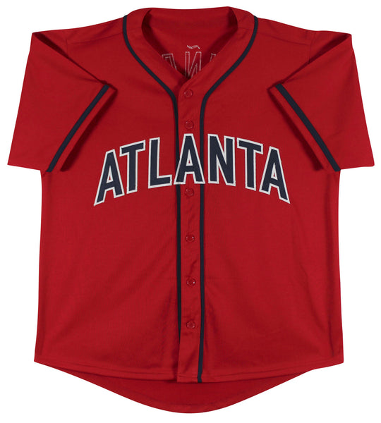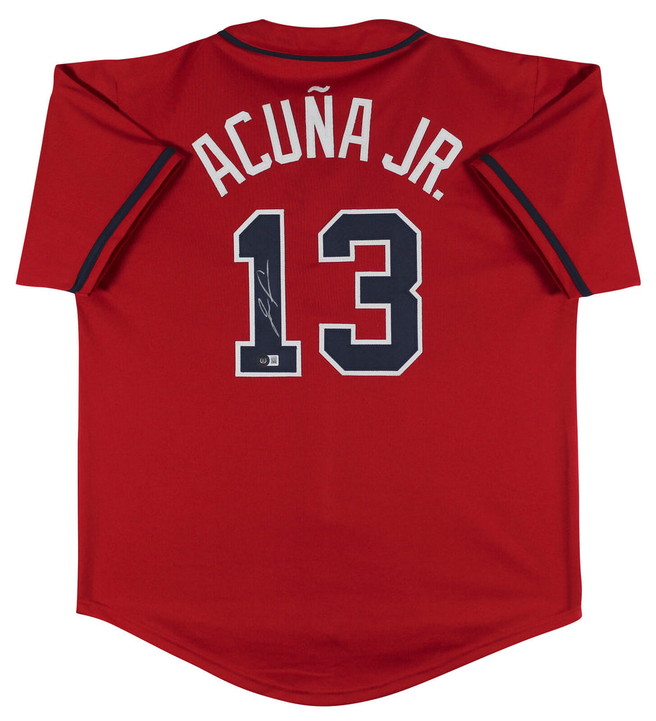 This Autographed Red Pro Style Jersey has been Personally Signed by Ronald Acuna Jr. of the Atlanta Braves. This item is 100% Authentic to include a hologram by Beckett Authentication Services. This item will come with the new Beckett Authentication hologram that has a scannable QR code rather than the traditional COA. If you would like to have a COA, you are welcome to reach out to Beckett for a printed certification once you receive your item. This is a BAS Witnessed Protection Program item which means a Beckett Authentication Service representative was present when this item was being signed. We conducted an autograph signing with Ronald Acuna Jr. where multiples of the same item were signed. While the photographs are representative of this item, the size, placement and strength of the signature may vary. Each item is hand signed, therefore, each autograph is unique. This item can be verified through BAS Witnessed. This is a X-Large sized, non-branded, custom-stitched Jersey.