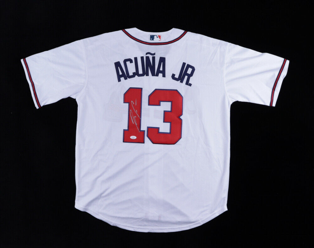 Custom on-field Nike style jersey. Everything is sewn on, size XL. Hand-signed by Ronald Acuna Jr. (Atlanta Braves). The lot / autograph(s) includes an official James Spence Authentication (JSA) hologram and matching COA for authenticity purposes.Authentication: JSA COA