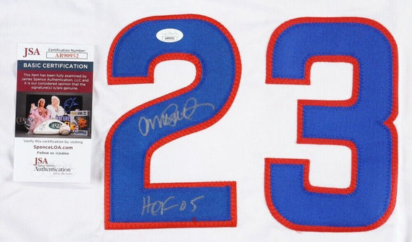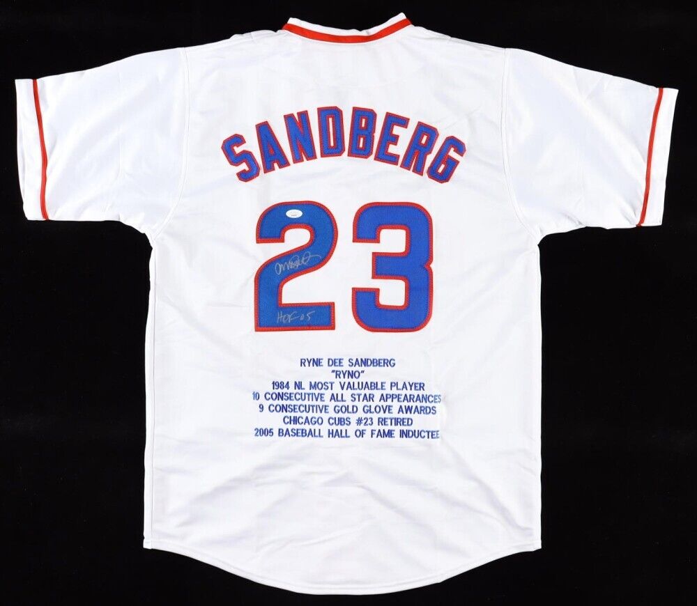 Custom on-field style jersey with everything sewn on, size Large. Jersey has been hand-signed and inscribed by Ryne Sandberg (HOF).The autograph(s) includes an official James Spence Authentication (JSA) hologram and matching COA for authenticity purposes.Authentication: JSA COA