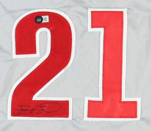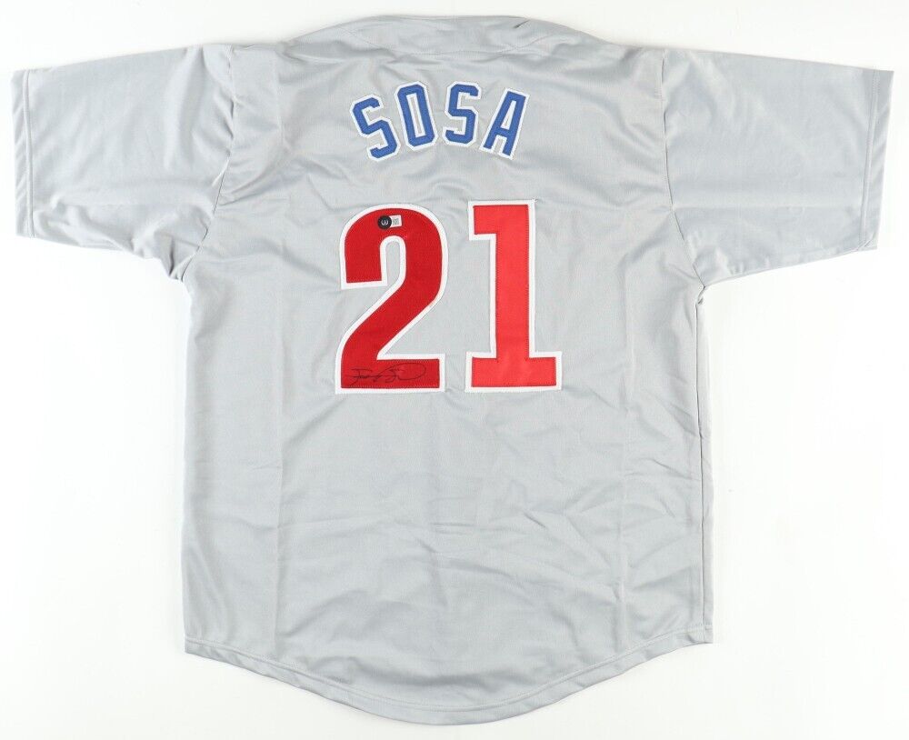 Custom on-field style jersey. Everything is sewn on, size XL. Has been hand-signed by Sammy Sosa.The lot / autograph(s) includes an official Beckett Authentication Services serially-numbered hologram and matching COA for authenticity purposes. The signing of this item was witnessed by Beckett.Authentication: Beckett COA Samuel Kelvin Peralta Sosa (born November 12, 1968) is a Dominican American former professional baseball right fielder. Starting his career with the Texas Rangers, Sosa became a member of the Chicago Cubs in 1992 and became one of the game's best hitters.