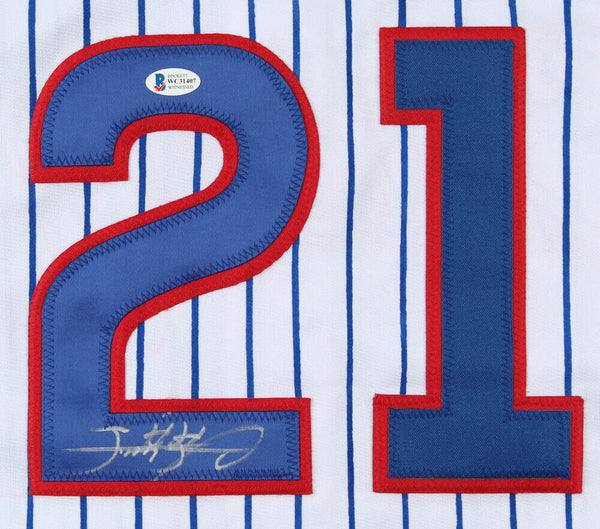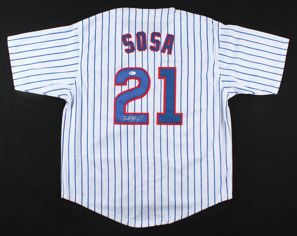 Custom on-field style jersey. Everything is sewn on, size Adult XL. Hand-signed by Sammy Sosa.Samuel Kelvin Peralta Sosa (born November 12, 1968) is a Dominican American former professional baseball right fielder. Starting his career with the Texas Rangers, Sosa became a member of the Chicago Cubs in 1992 and became one of the game's best hitters.The lot / autograph(s) includes an official Beckett Authentication Services serially numbered hologram for authenticity purposes.Authentication: Beckett Hologram